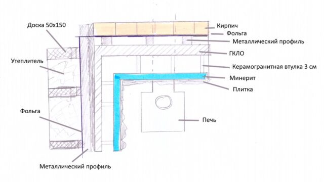 Тут можно видеть по сути два защитных экрана. Ближний к стене изготовлен из плит огнестойкого гипсокартона ГКЛО, установленных на металлические профили. Дополнительный отражающий слой выполнен из фольги, закрепленной непосредственно на стену. Поверх гипсокартона выполнен монтаж плит минерита на саморезы через 3-см керамогранитную втулку. Теплозащитные плиты отделаны плиткой, которая укладывается на термостойкий клей.