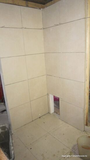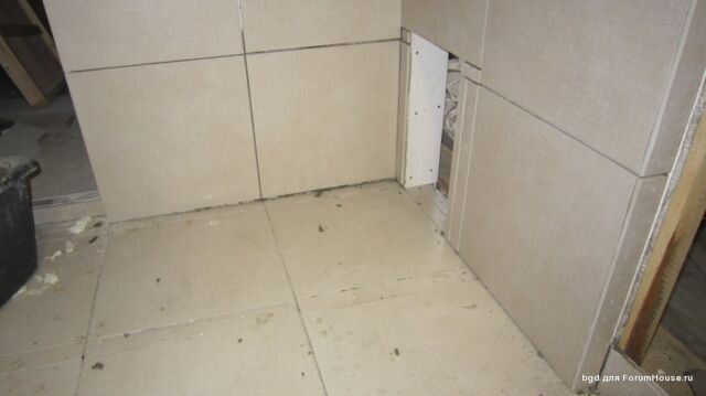 Стены возле печи также защищены слоем стекломагнезита на металлических профилях, отделанного керамогранитной плиткой на термостойком клее.