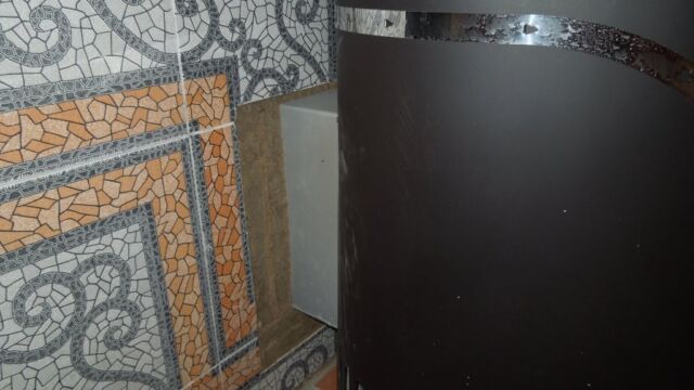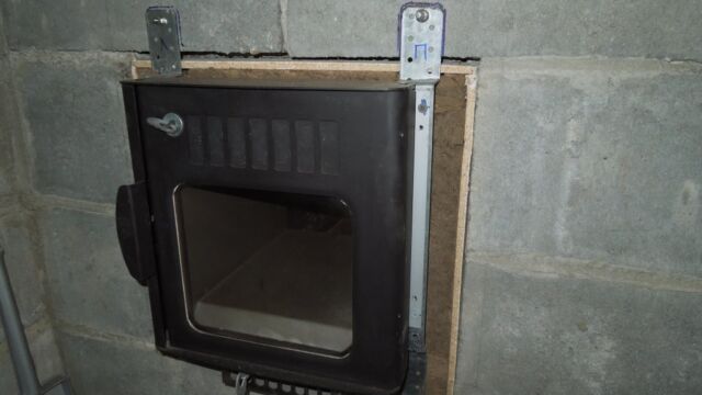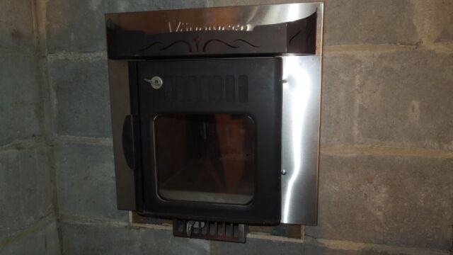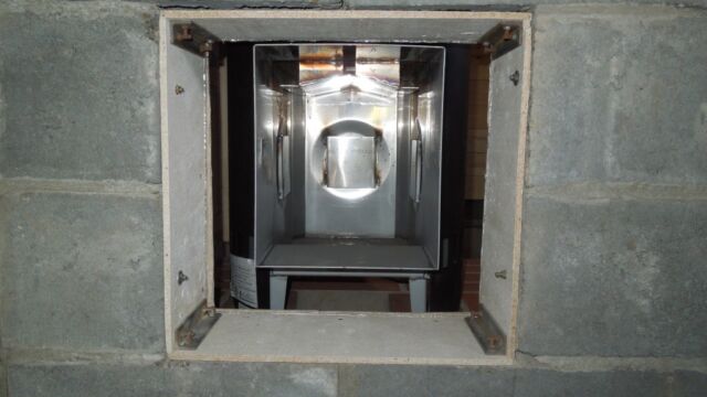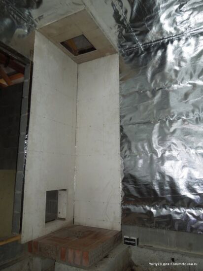 На следующих фото хорошо видно, как защищена стена в месте выхода топочного окна.