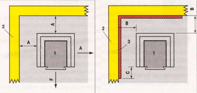 Согласно нормативам, взятым из СНиП 2.04.05-91, расстояния от печи до ничем не защищенной стены, имеющей предел огнестойкости REI 60, должно составлять не менее 500 мм (на схеме А), то есть полметра. Если установить на стену плотный лист негорючего материала (минерит или стекломагнезит) и дополнительно закрепить на нём отражающий слой нержавеющей стали, то данное стандартное расстояние уменьшается до 380 мм (на схеме В).