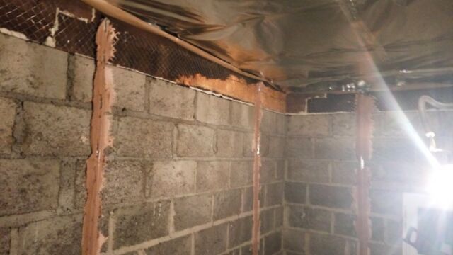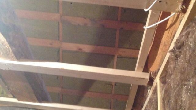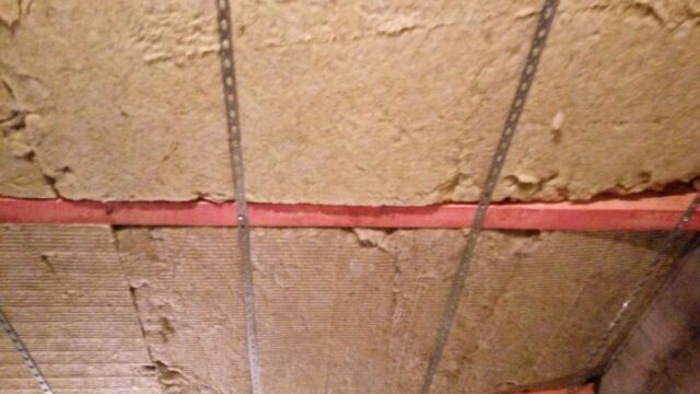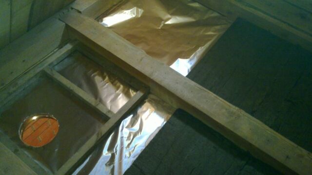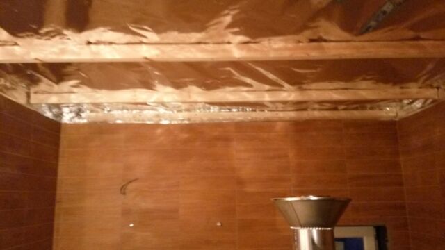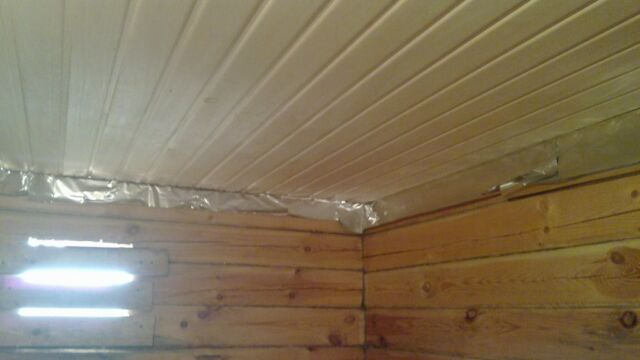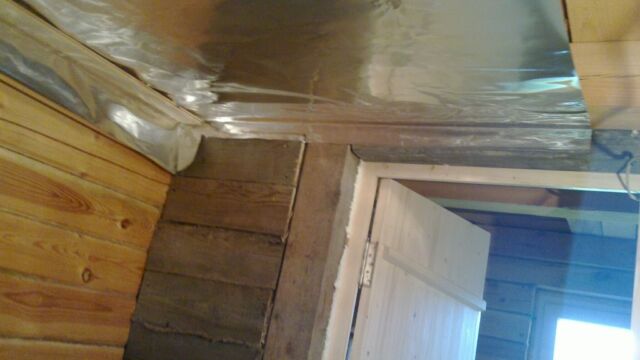Укладка теплоизоляционных плит в данном случае происходит на слой чернового потолка, то есть по сути утепление выполняется со стороны чердака. Изнутри, со стороны парной, черновой потолок обшивается слоем фольгированной пароизоляции на крафт-бумаге. Этот слой должен быть полностью герметичным, чтобы не пропускать пар в прослойку с утеплителем и незащищенными деревянными лагами. Для этого все стыки между полосами плёнки проклеиваются фольгированным скотчем.