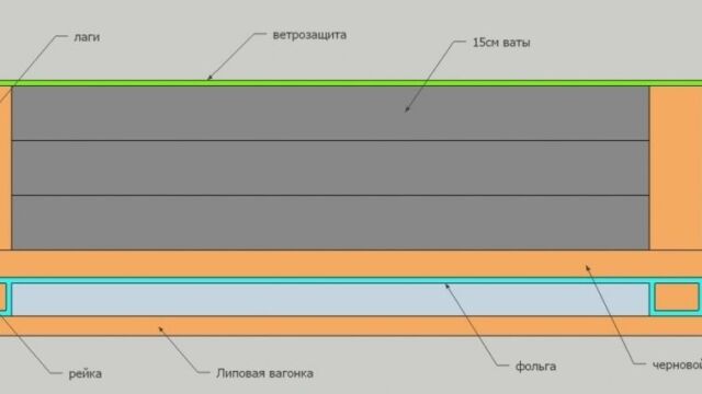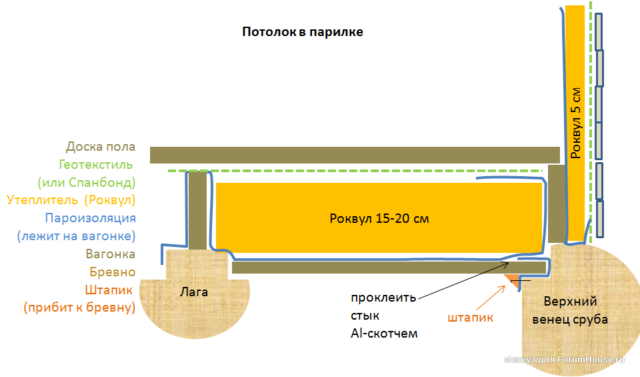 Ниже представлена схема обустройства потолка в парилке с указанием расположения и названия каждого из слоёв. Тут используется рекомендованные 15 см базальтовой ваты для теплозащиты, а поверх неё можно видеть прослойку из ветрозащитной паропропускной мембраны. Очень важно использовать именно паропроницаемый материал, так как в противном случае утеплитель будет закрыт с двух сторон герметичным материалом и влага из него не сможет выветриваться.