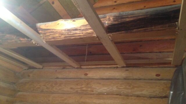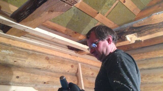Для балок из бревен можно сделать монтаж обрешетки под вагонку, как показано на фото. Далее со стороны парилки на обрешетку укладывается фольгированная пароизоляция и на неё выполняется монтаж вагонки или досок чистового потолка. А на чердаке выполняется укладка слоя утеплителя, который закрывается паропропускной водозащитной мембраной.