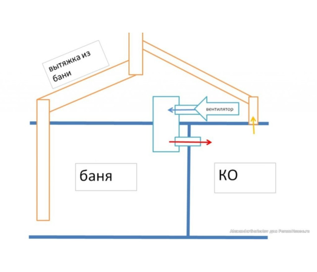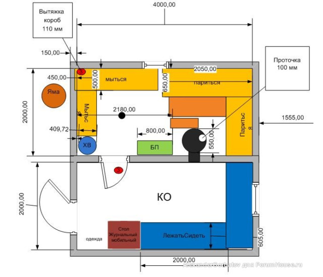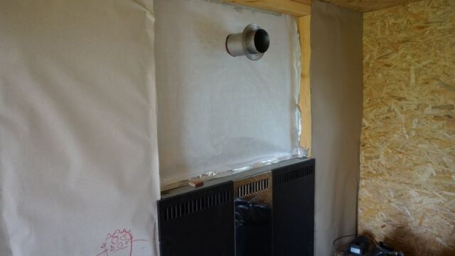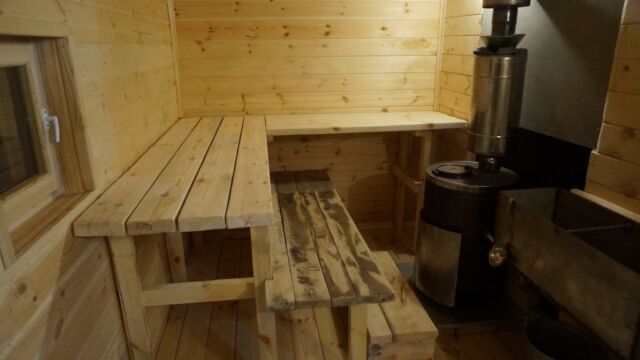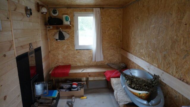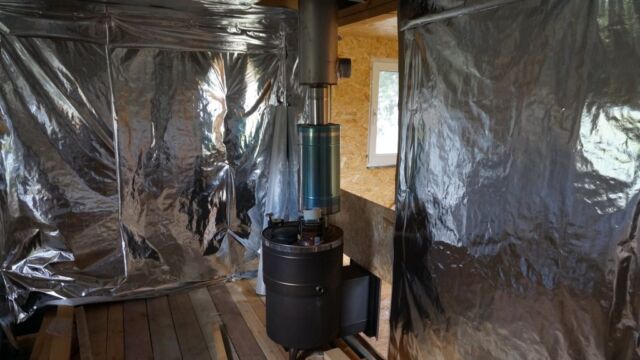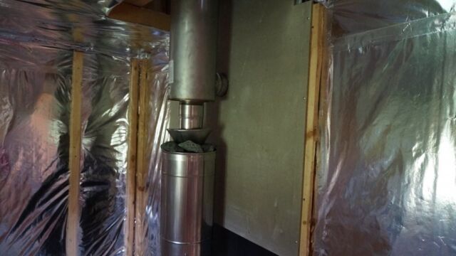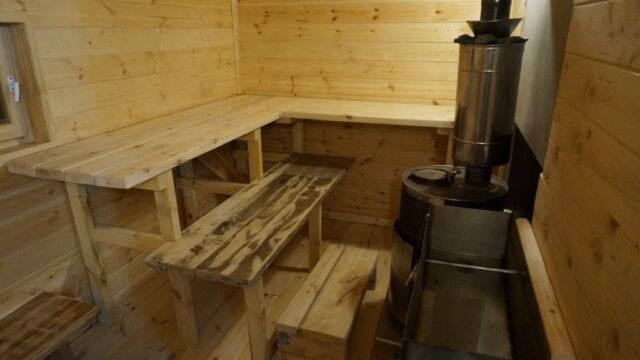 На последнем фото — вид комнаты отдыха с топкой печи. Внутри стены обшиты ОСП (OSB), но, конечно, более предпочтительно использовать вагонку или другую отделку необработанным материалом из дерева. Также можно видеть трубу, выходящую из парилки в комнату отдыха — это часть системы вентиляции, схема которой также прилагается.