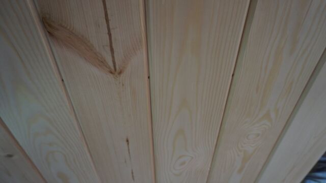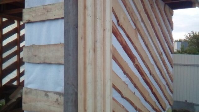 Защита стены возле печи выполнена из плит ЦСП. Финишная обшивка стен из имитации бруса толщиной 20 мм и шириной 130 мм.