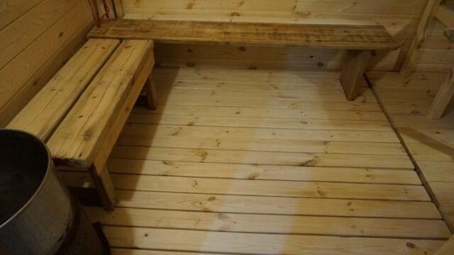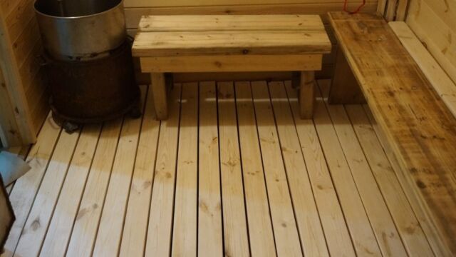 Чистовые доски пола укладываются с небольшими промежутками для того, чтобы обеспечить сток воды на поверхность гидроизоляционной плёнки. По гидрозащитному слою, размещенному на утеплителе с небольшим уклоном вода стекает к сливному отверстию. Монтаж досок пола выполняется на деревянные балки в зоне парения и на металлические трубы в зоне моечной.