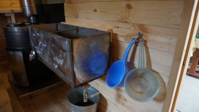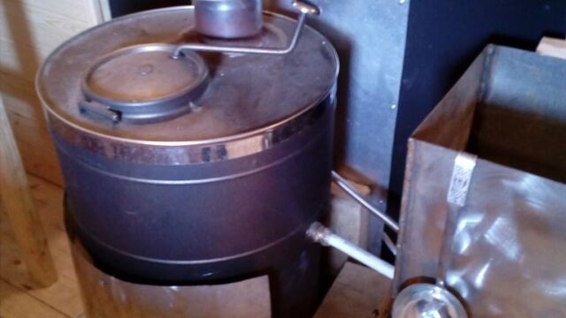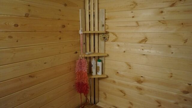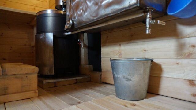 Ёмкость для воды и трубы, идущие от печи, дают возможность удобно помыться горячей или холодной водой.