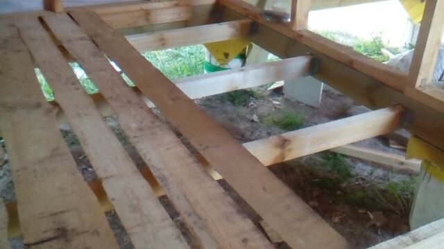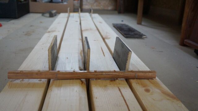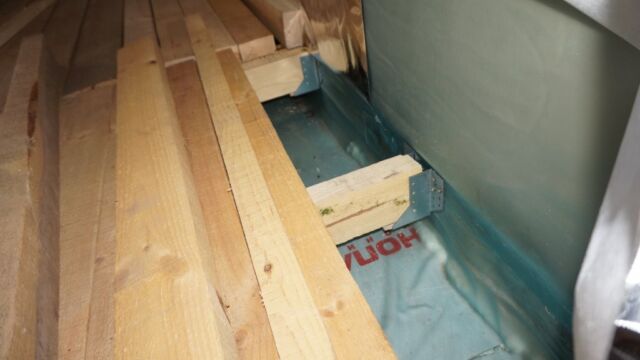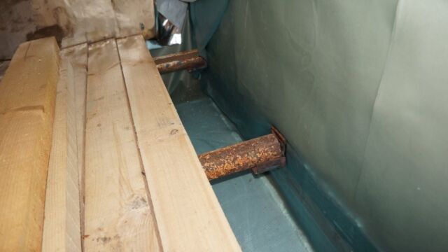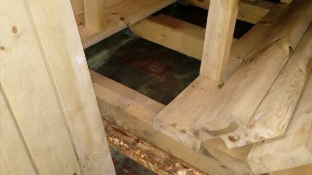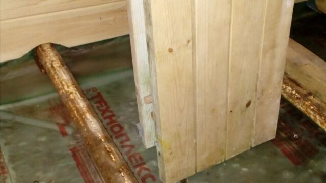 На последнем фото видно технологию изготовления настила пола в помывочной зоне из блоков по четыре доски, соединенные перегородками. В полу изготовлен специальный вентиляционный канал, чтобы проветривать подполье и не допустить гниения половых досок. Стены, внутри которых размещены 10 см плиты минваты, обшиваются фольгированной пароизоляцией на крафт-бумаге.
