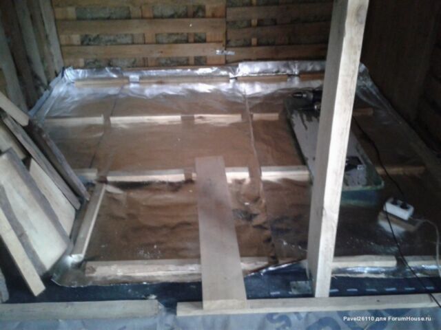 Пол закрыт плотной фольгированной гидроизоляцией с проклейкой всех швов фольгированным скотчем.