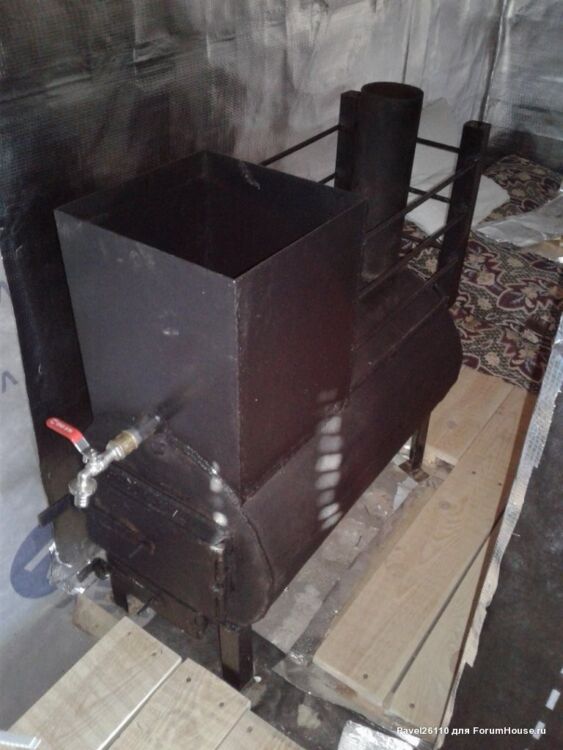 Поверх гидрозащиты устанавливается обрешетка для чистового пола из доски 150х25 мм. В качестве топочного агрегата устанавливается самодельная металлическая печь.