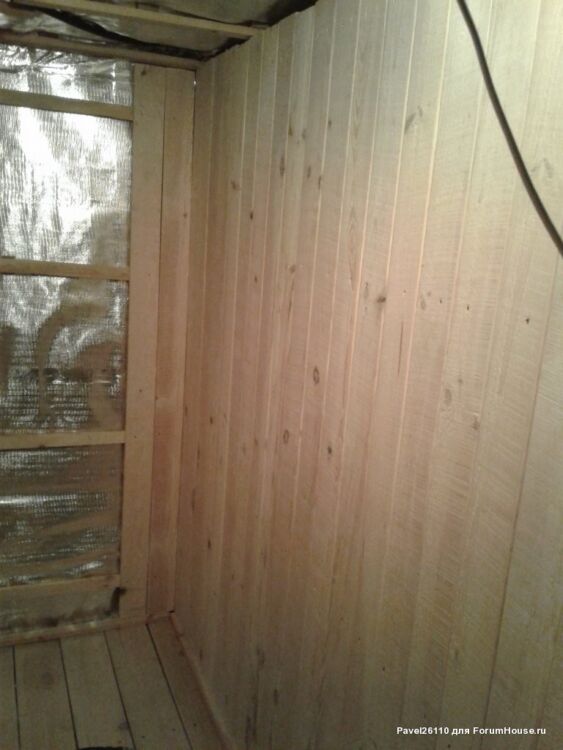 Стены парилки обшиты фольгированной пароизоляцией на крафт-бумаге и закрыты деревянной доской 100х15 мм на обрешетке. Вагонка не устанавливалась из соображений экономии, так как баня всё-таки строится бюджетная.