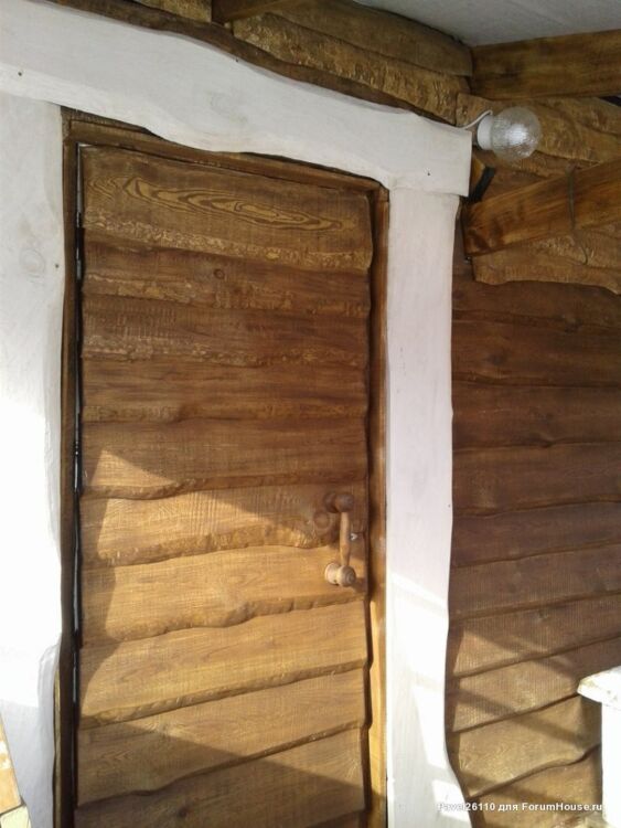 Вот так выглядит дверь со стороны входа в баню через веранду. Итоговая стоимость всех материалов составила не более 1700$. Несмотря на дешевизну строения, не стоит пренебрегать правилами пожаробезопасности. Стена возле печи обязательно должна быть отделана жаропрочным листовым материалом, а проход дымохода через крышу изготовлен с отступами от деревянных конструкций не менее 10-15 см с каждой стороны.