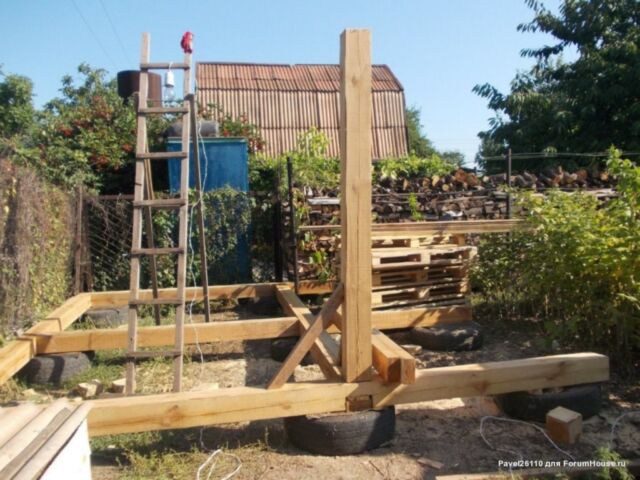 Обвязка выполняется из бруса 150х150 мм, уложенного на рубероид, настеленный над покрышками. Размеры ростверка по периметру — 4х4 метра. Вертикальный столбик на фото также из бруса 15х15 см разделяет конструкцию на внутреннее пространство и крыльцо.