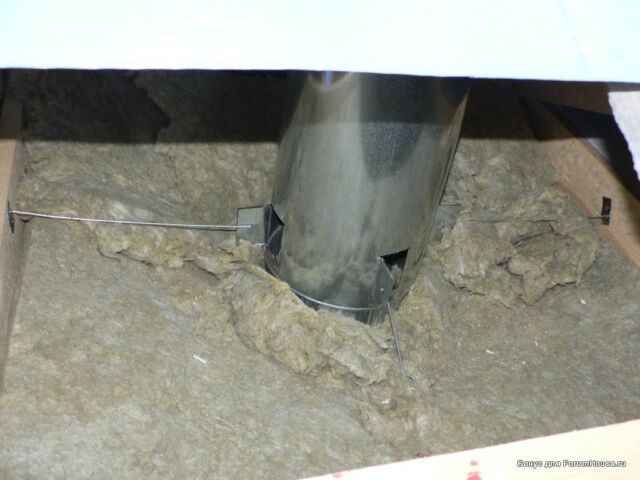 Пространство между трубой и деревом заполняется негорючей минеральной ватой, а со стороны парилки обшивается металлическим листом. Данное решение было взято из статьи Маленькая баня своими руками, в которой подробно расписана технология изготовления недорогой каркасной бани со сварной металлической обвязкой и размерами 4,8х2,6 метра.
