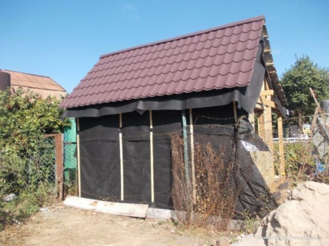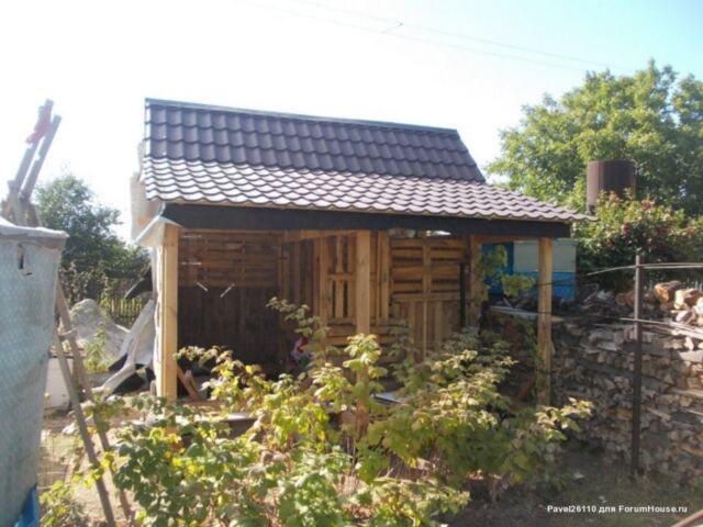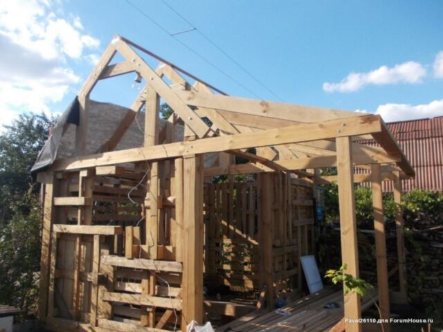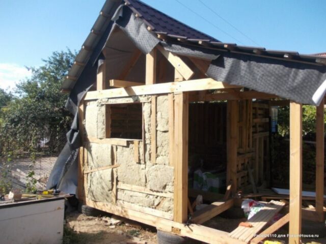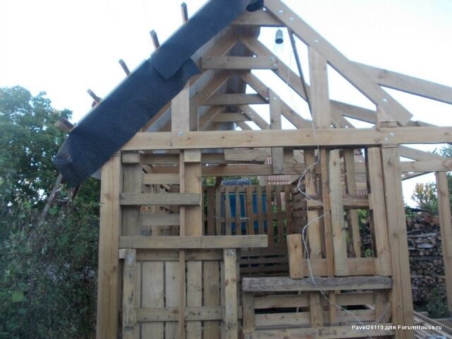 Стены изготовлены из деревянных поддонов с утеплением плитами минеральной ваты по всему периметру. Все доски и брус обработаны антисептиком.