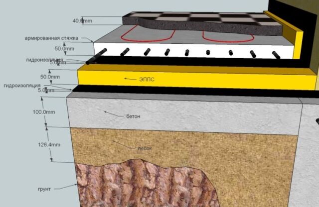 На гидроизоляцию укладываем листы пенопласта с плотностью не менее 40 кг/м³ и толщиной 10 см. Если в качестве теплозащитного материала был выбран ЭППС, то его можно класть слоем толщиной 5 см. На Утеплитель укладывается ещё один слой гидроизоляционной плёнки, а поверх него заливается ещё одна бетонная стяжка с армированием.