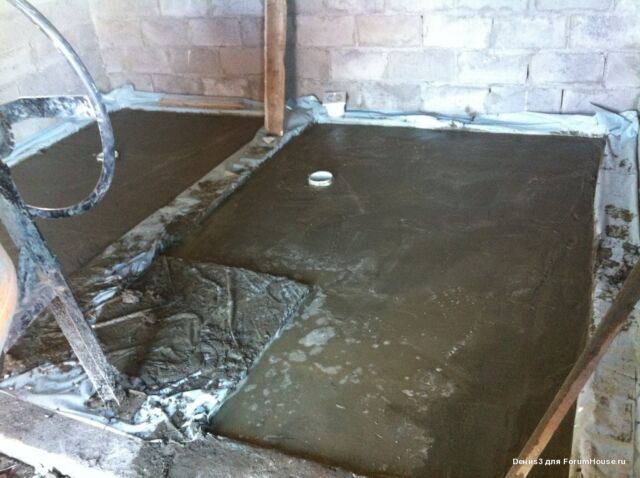На слой гидроизоляции происходит заливка раствора для стяжки пола толщиной 5-10 см, поверх которого укладывается керамогранитная плитка. Важно чтобы гидроизоляция выполнялась с небольшим нахлестом на стены, чтобы вода не затекала и не скапливалась в углах между полом и стеной.