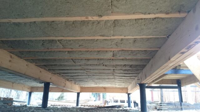 Монтаж утеплителя происходит, как правило, на черновой пол, который предварительно обустраивается под лагами пола. Его можно сделать из обычных досок, либо из плит ОСП (OSB) толщиной 10 мм.
