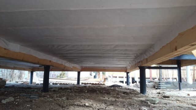 Всегда нужно помнить, что утепляя полы в бане нужно надежно защищать фундамент от влаги, идущей из внутренних помещений. Независимо от того, сделано ли основание из деревянных балок или из бетона, оно должно быть изолированно от попадания воды плотным цельным слоем плёнки гидробарьера с нахлестом на стены. Этот нахлест соединяется специальным гидриозоляционным скотчем с парозащитной пленкой стен и образует с ней сплошой слой без щелей или разрезов.