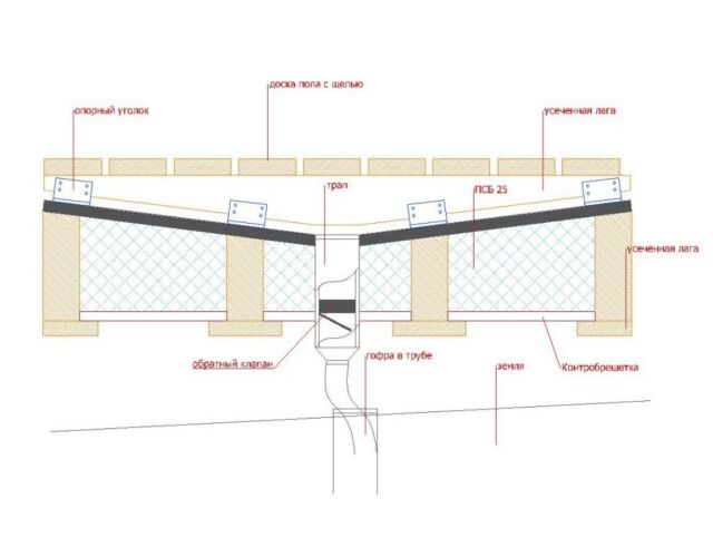 Для пола в парилке прежде чем производить все работы следует установить пластиковую сливную трубу. На примере парной с деревянным полом и грамотно организованным сливом ниже показана схема, в которой использован пенопласт в качестве утеплителя. В данном случае взят распространенный материал ПСБ-25.