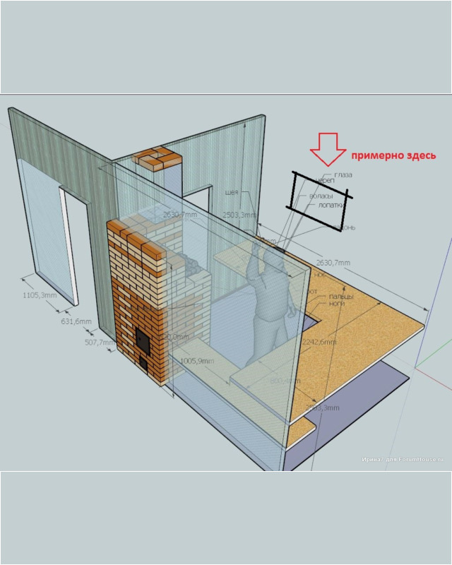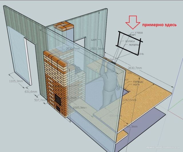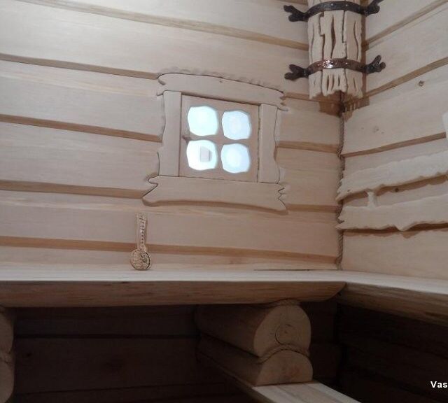 Расположение окна внутри парилки выбирается таким образом, чтобы оно было желательно по центру полока, где будет лежать человек, которого будут парить.
