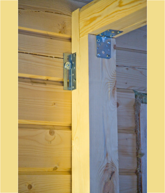 Перегородка на фото выше установлена на стены с помощью специальных металлических креплений, рассчитанных на создание так называемой «скользящей перегородки». Уголок фиксируется неподвижно на брусок простенка, а к стене сруба монтаж выполняется на нержавеющие саморезы так, чтобы они могли двигаться внутри вертикального паза крепления.
