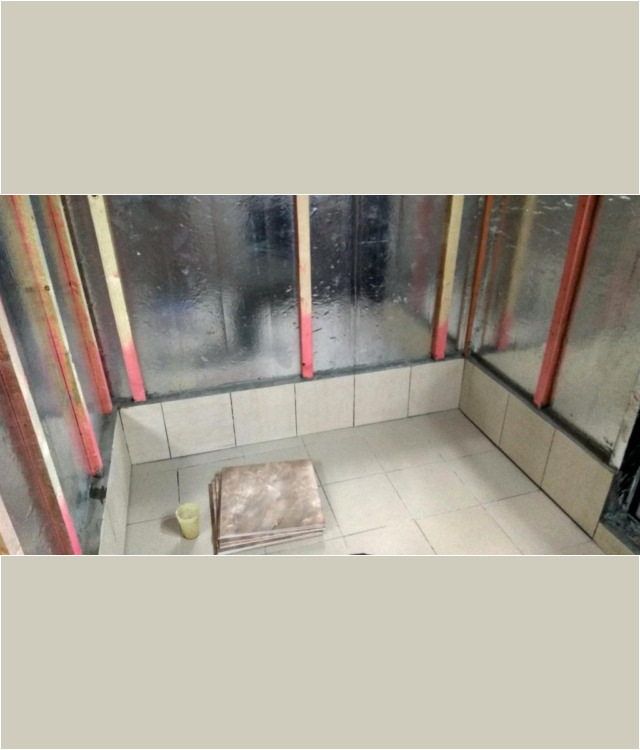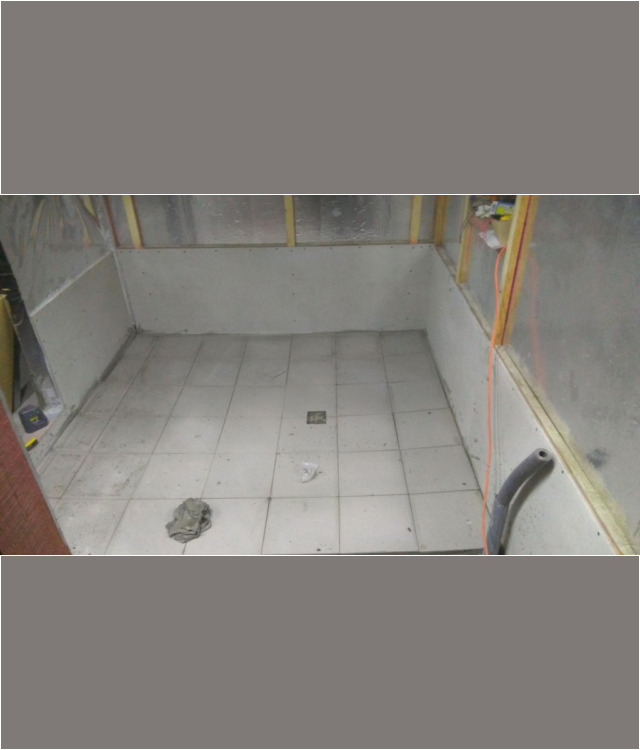 Как видно на фото, поверхность стены у пола имеет небольшой цоколь из плитки. Плитка монтируется поверх плит СМЛ или ЦСП на специальный клей. Плиты крепятся непосредственно к каркасу или на скользящую конструкцию, если есть примыкания к стенам сруба.