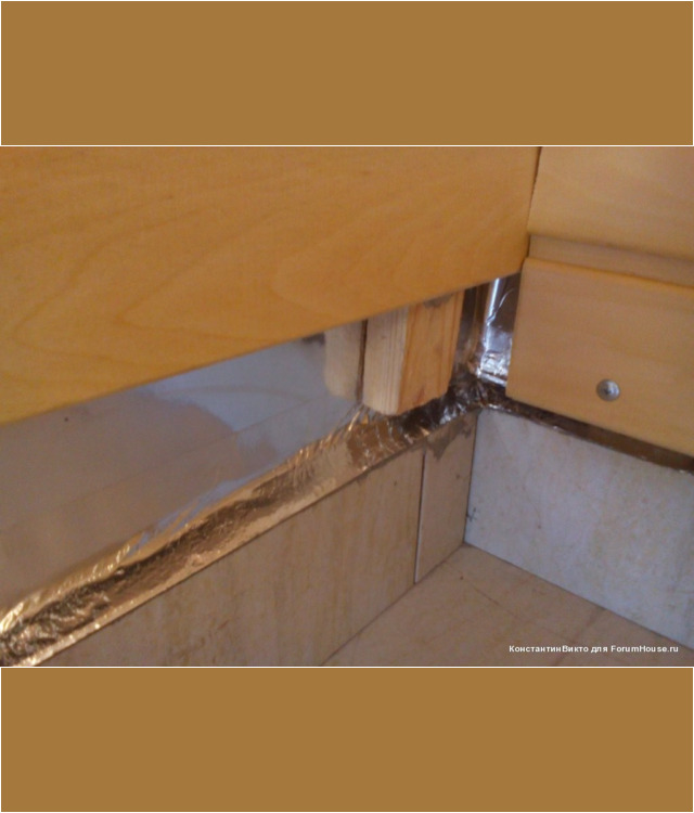 Поверх деревянного каркаса со стороны парилки укладывается фольгированная пароизоляция на крафт-бумаге. Все стыки материала проклеиваются фольгированным скотчем. Никаких незакрытых отверстий и повреждений в слое паробарьера быть не должно, чтобы влага не проникала в простенок.