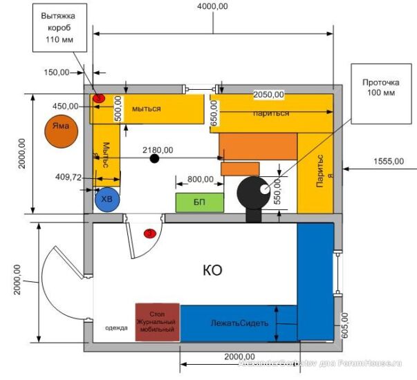 На последнем фото — вид комнаты отдыха с топкой печи. Внутри стены обшиты ОСП (OSB), но, конечно, более предпочтительно использовать вагонку или другую отделку необработанным материалом из дерева. Также можно видеть трубу, выходящую из парилки в комнату отдыха — это часть системы вентиляции, схема которой также прилагается.