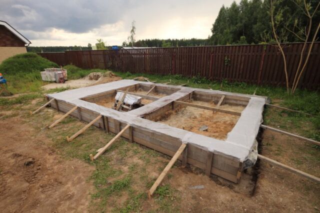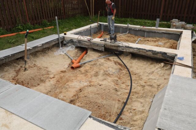 На предыдущих фото можно видеть, что внутри ленты фундамента уже засыпан слой песка. Эта процедура является необходимой при дальнейшем изготовлении бетонных полов. Дело в том, что поверхность грунта всегда неоднородна и как бы вы её не выравнивали и не утрамбовывали, она со временем под давлением веса бетонной стяжки будет уплотняться, но процесс этот произойдет неравномерно. Таким образом, в каких-то точках бетонная плита будет перегружена, а где-то образуется провисание, что может привести к её разрушению.