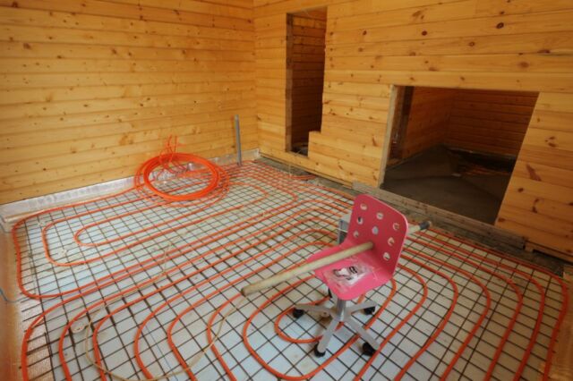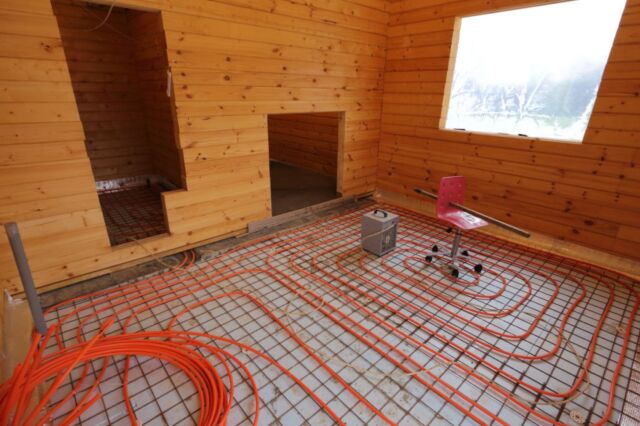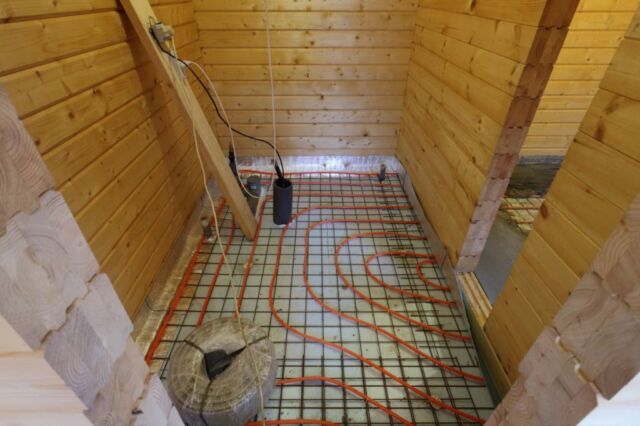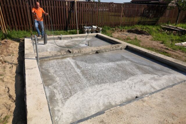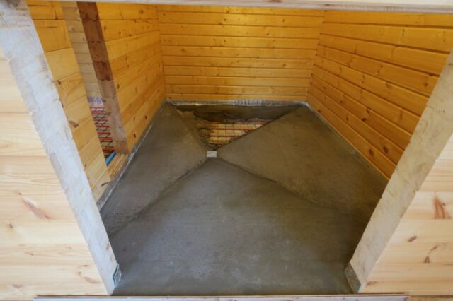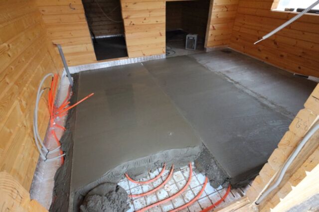 Следующий этап укладки пола выполняется уже после установки стен и крыши. На бетонную плиту кладется слой гидроизоляции, на который укладывается та же металлическая армирующая сетка. На неё выкладываются плиты экструдированного пенополистирола толщиной 10 см. Далее устанавливаются направляющие маяки, по которым будет выполняться заливка и выравнивание бетонного раствора, его толщина составляет 7-10 см. При желании предварительно можно установить трубы тёплого пола, чтобы будущий бетонный пол в бане был всегда тёплым.