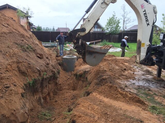 Чуть дальше от бани располагается сливная яма. Для её обустройства можно использовать готовые септики или самостоятельно изготовить конструкцию для сбора стоков. В данном случае непосредственно на месте строительства был собран септик из бетонных колец, под который с помощью экскаватора предварительно вырыли котлован необходимой глубины.