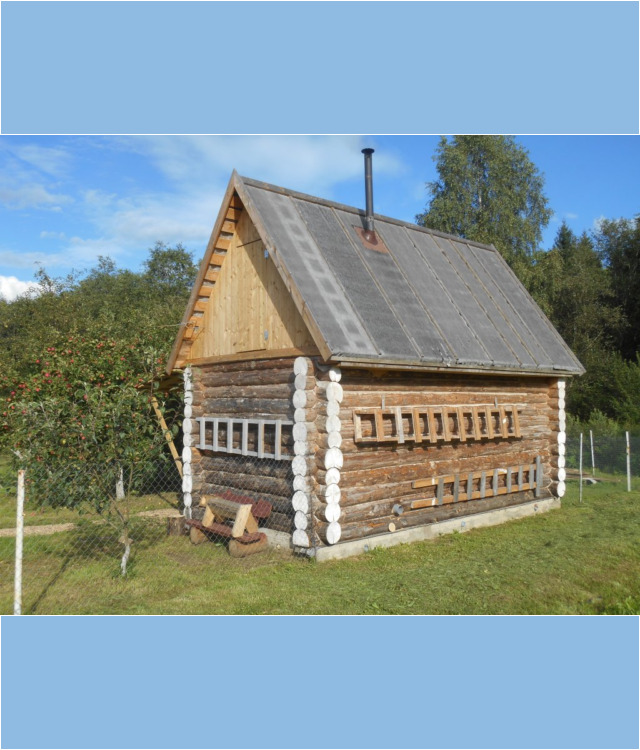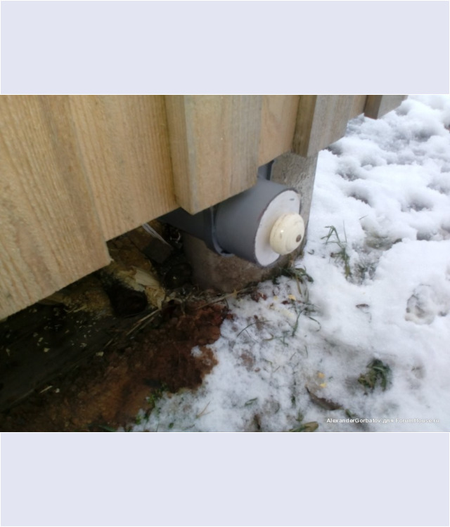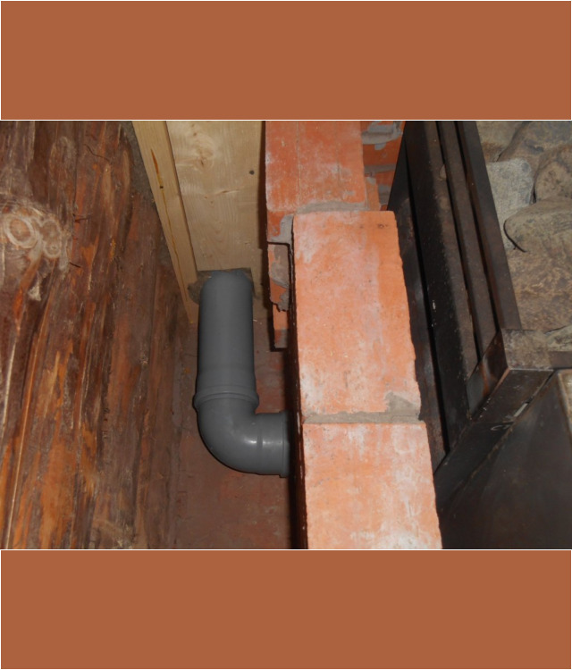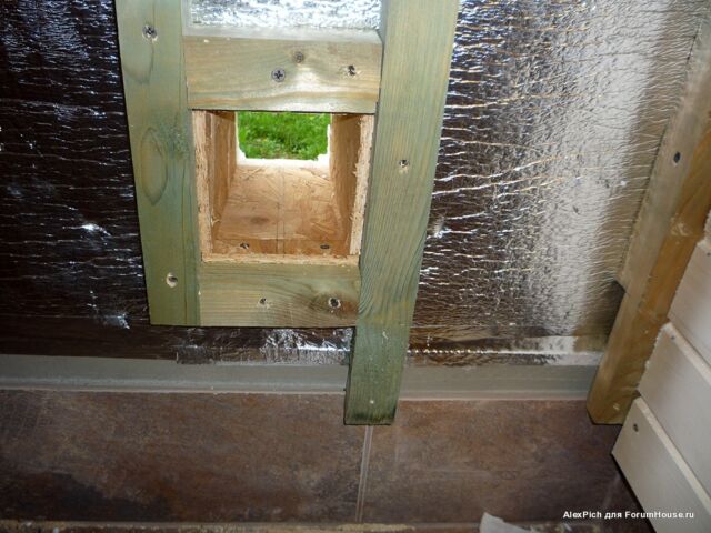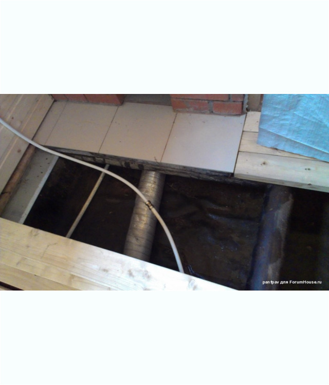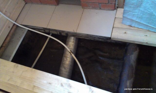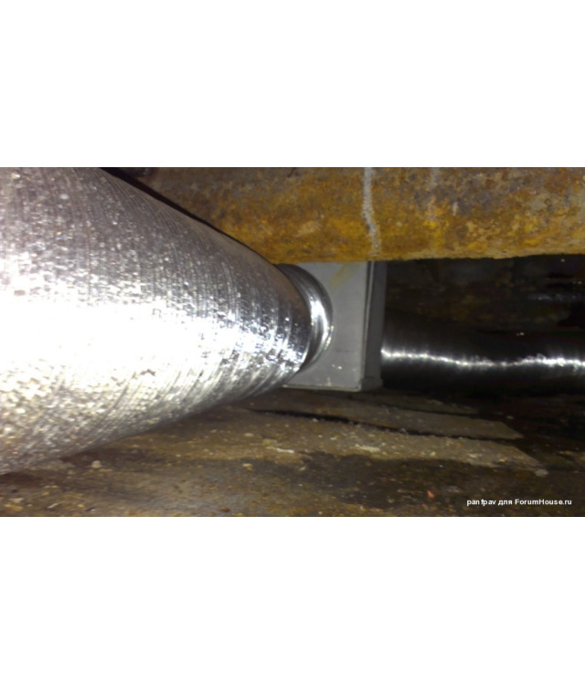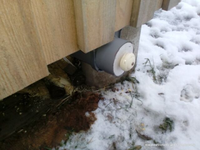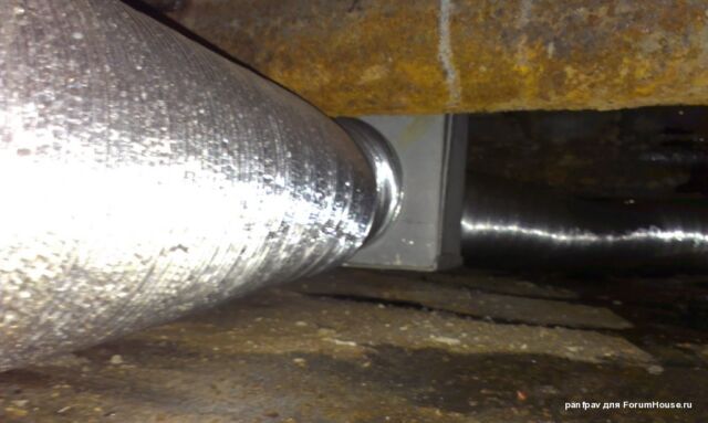 Тут хорошо видно, что труба заходит в подполье, что обеспечивает затягивание тёплого воздуха под половые доски и гарантирует их эффективный прогрев и просушку.