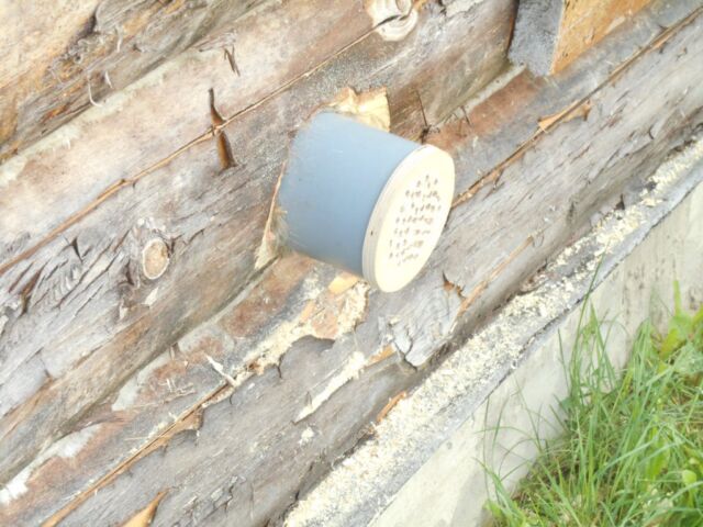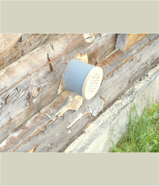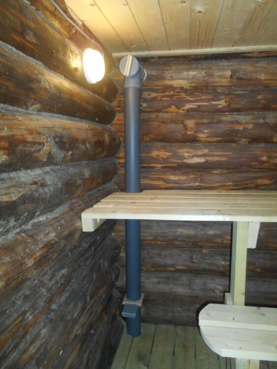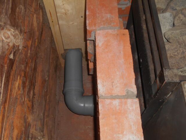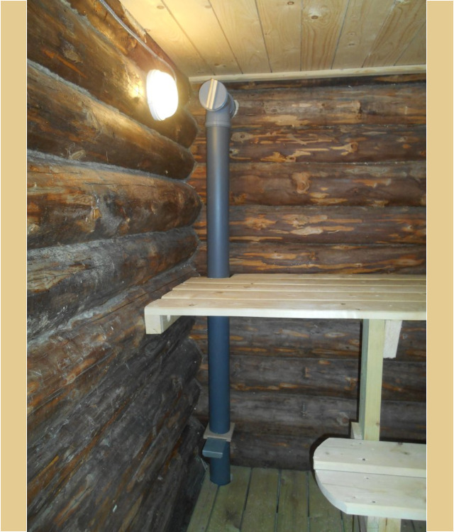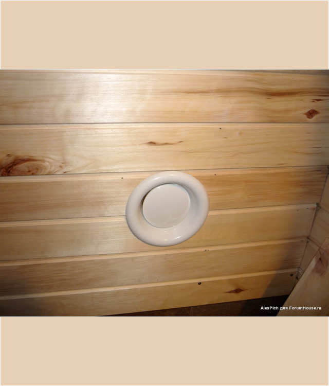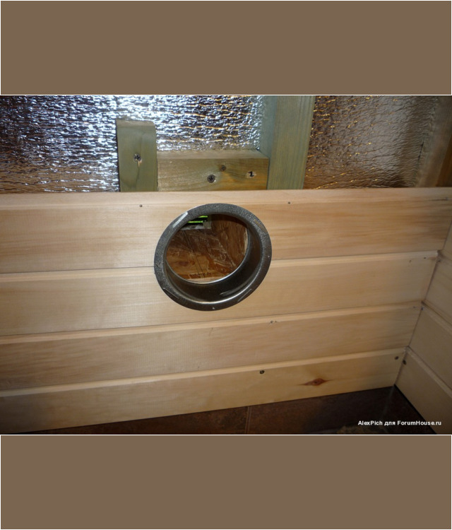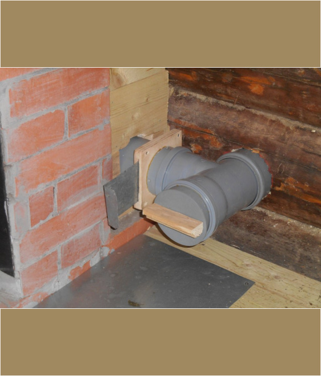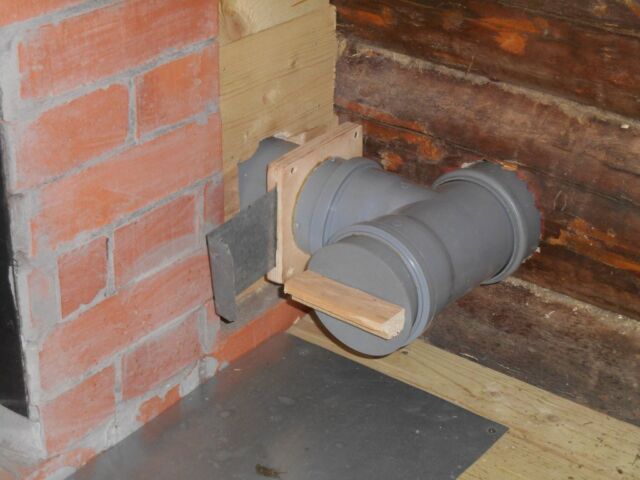 В одном из бревен было изготовлено отверстие, необходимое для установки в него пластиковой трубы диаметром 110 мм. После чего с помощью специального разветвителя была обеспечена возможность разделить канал на две части: одна заходит непосредственно в парилку возле печи, а вторая через специальную деревянную перегородку подходит к кирпичной обкладке печки с другой стороны.