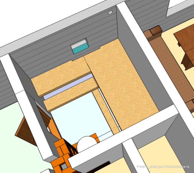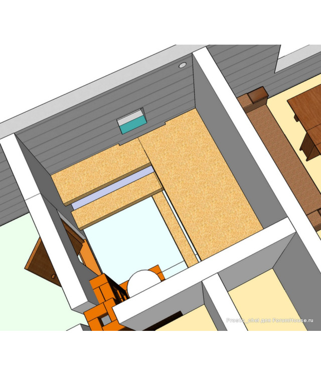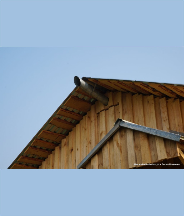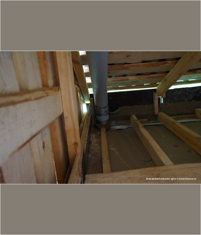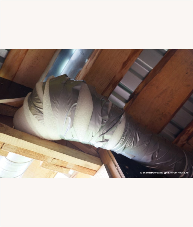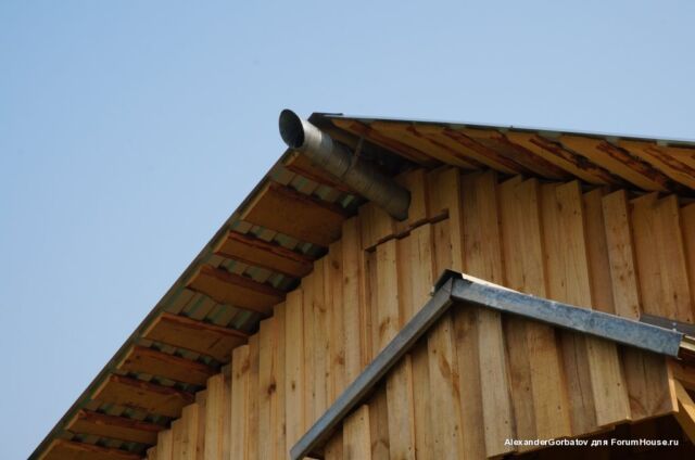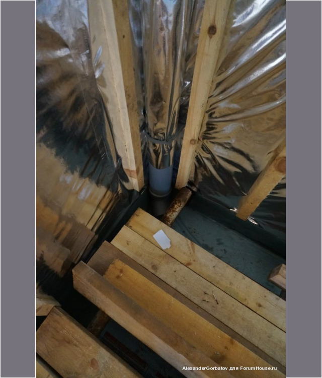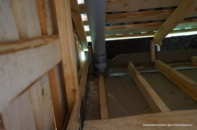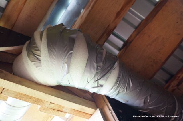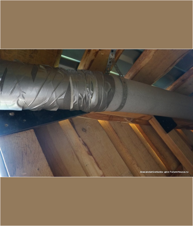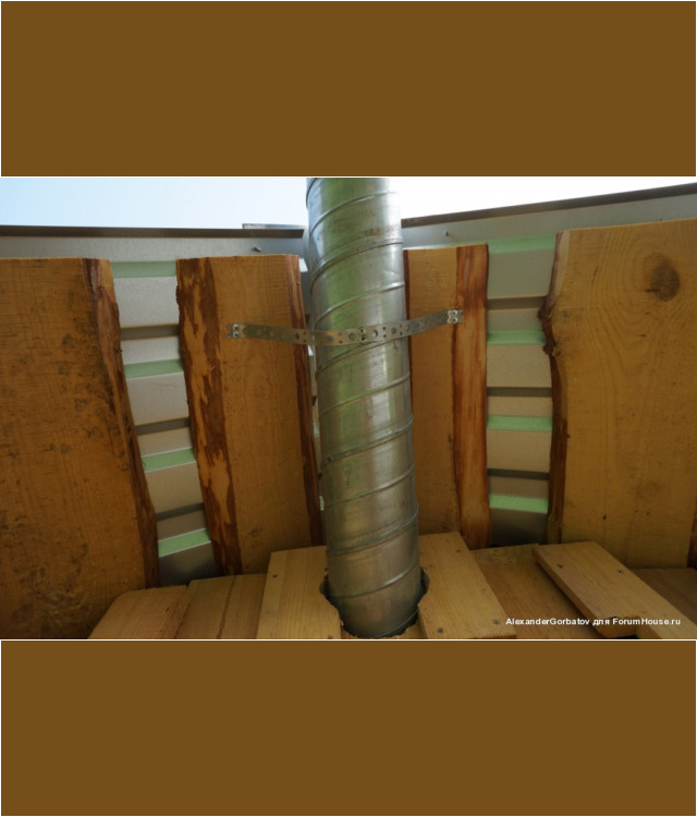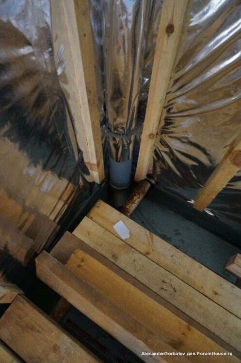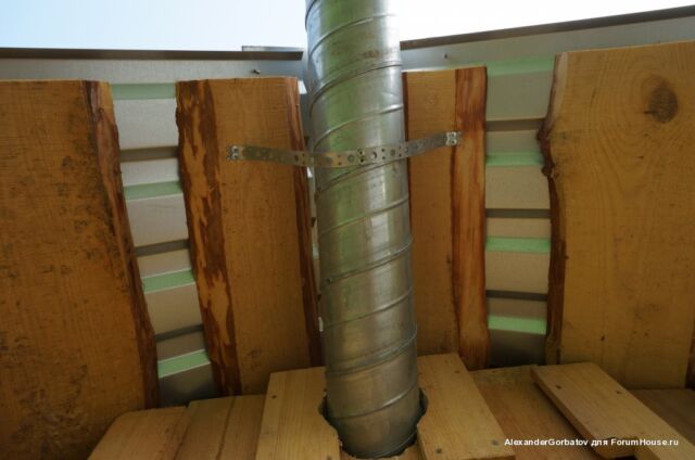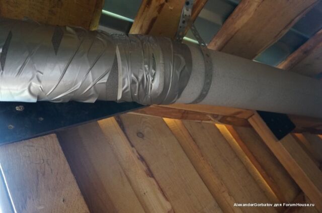 Для создания более сильной тяги из помещения парилки вытяжная труба выводится из неё через потолок на второй этаж и далее через стену или крышу на улицу. Если выход воздуховода выполняется через потолок, то рекомендуется выполнить его утепление. Если этого не сделать, то зимой труба на чердаке будет сильно охлаждаться. Этот приведет к тому, что горячий пар идущий из парилки на выход, при контакте с холодным материалом воздуховода, превратится в конденсат и осядет внутри трубы. В результате капли начнут стекатьвниз по каналу и попадать обратно в парилку, дополнительно увлажняя пространство возле трубы.