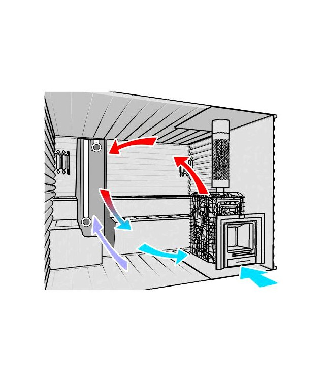 На схеме выше можно видеть все конструктивные элементы, необходимые при организации эффективной вентиляции в парном отделении. Здесь самое важное — это подача охлажденного уличного воздуха непосредственно под корпус печи. Такое решение позволяет минимизировать контакт человека с холодными потоками, идущими снаружи, так как они успевают в достаточной степени прогреться при входе в парилку, попадая на наиболее разогретый элемент в помещении — банную печь.